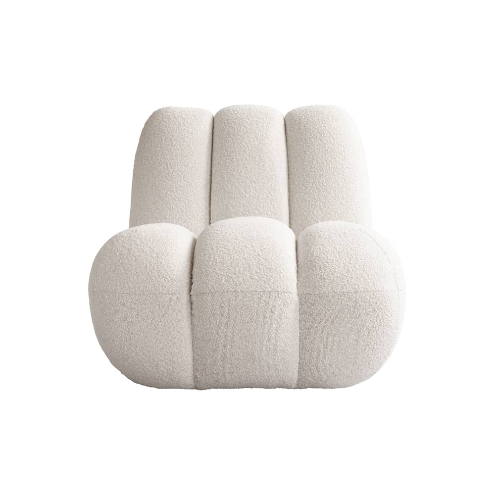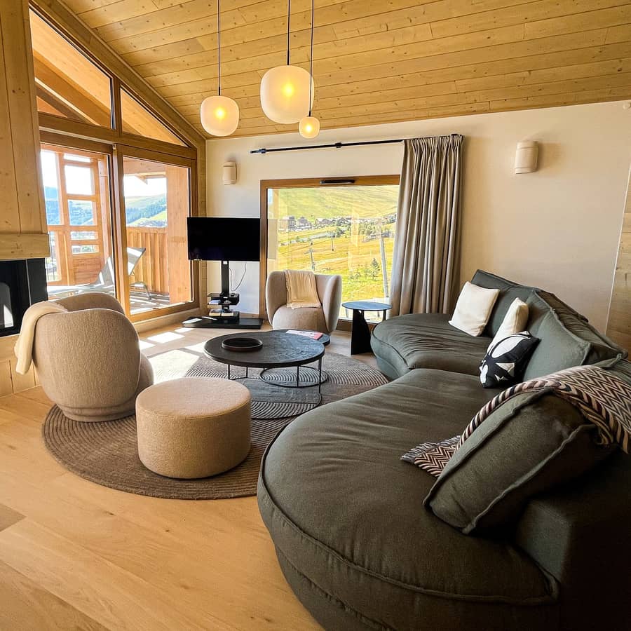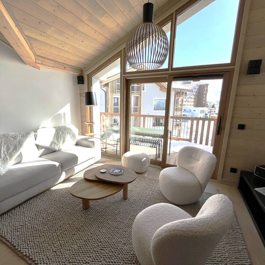 Le bois clair structure l’espace, tandis que des luminaires vaporeux créent une lumière apaisante. La grande table, dressée comme pour accueillir famille et amis, invite naturellement au partage. Les tissus doux, les revêtements en laine bouclée et les matières chaleureuses rappellent l’esprit chalet, mais dans une version contemporaine et élégante.