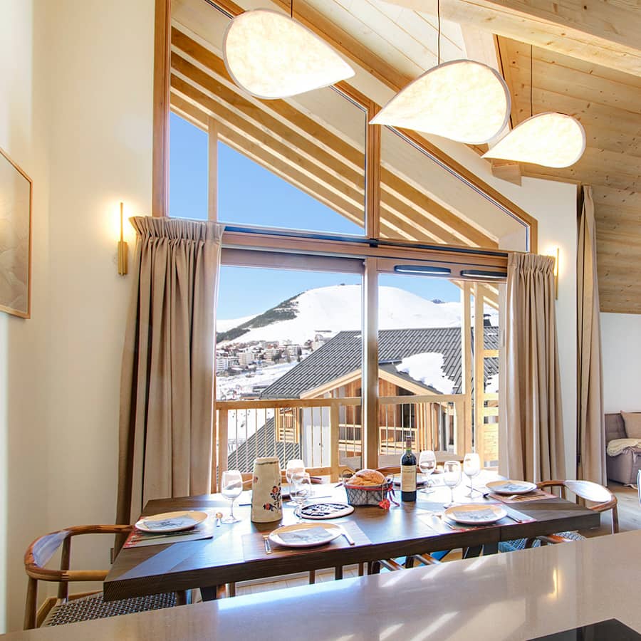 Dans la salle à manger, l’aménagement pensé par Made In Design Pro en partenariat avec le groupe PRIAMS met en scène une atmosphère douce et chaleureuse, parfaitement adaptée à un appartement en montagne.