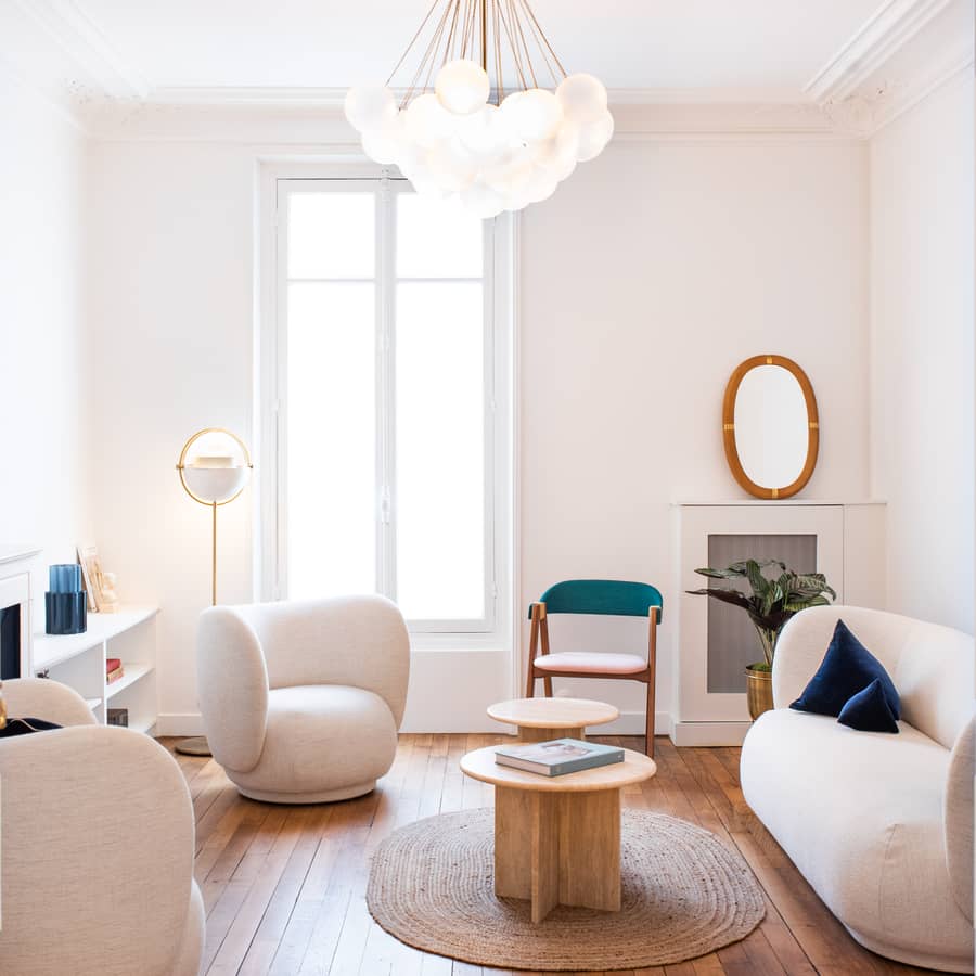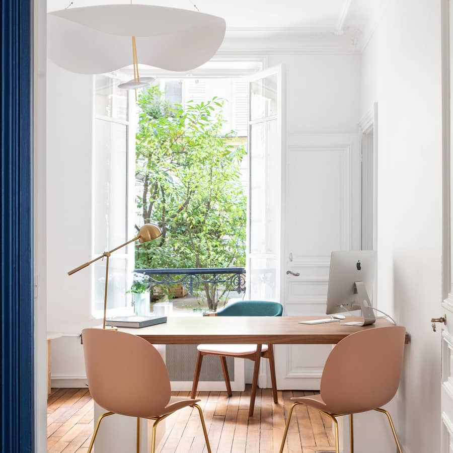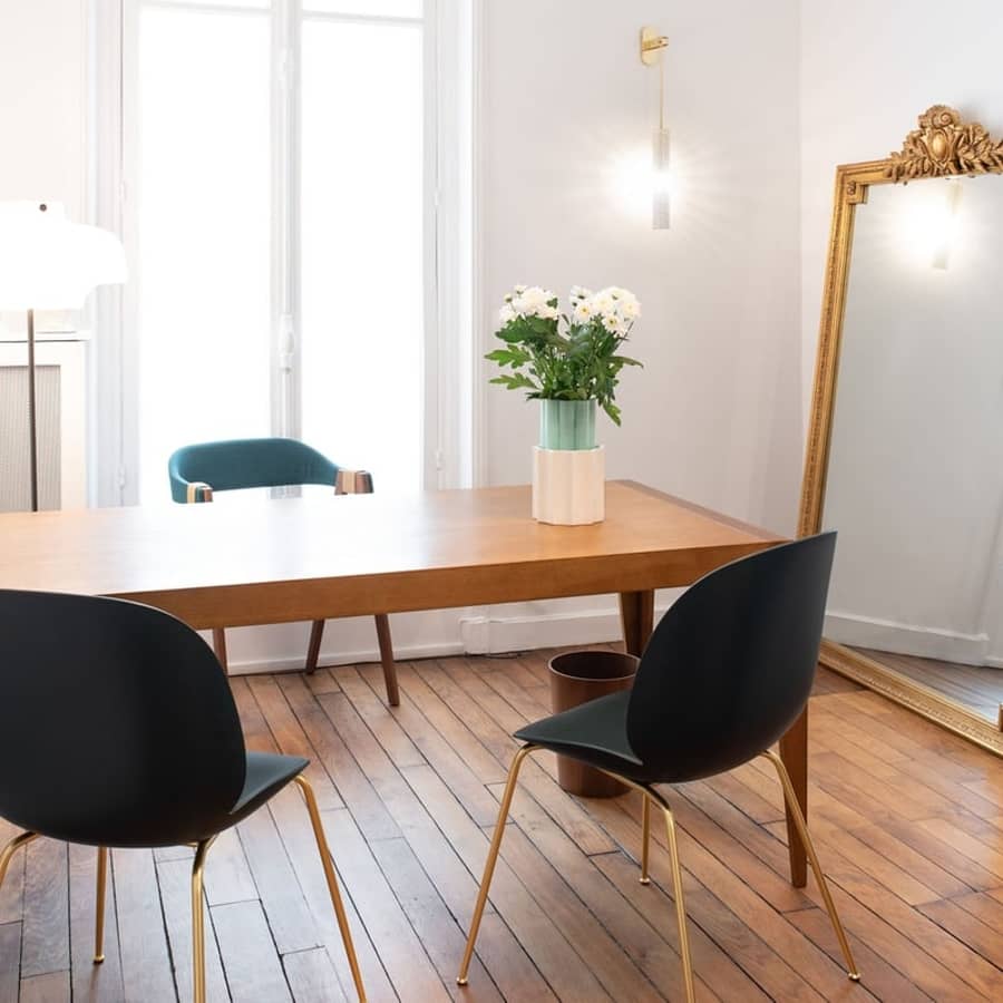 Enfin, le lampadaire Multi-Lite de Gubi structure l’éclairage d’appoint, tandis que les chaises BEETLE de Gubi signent une assise graphique et accueillante, parfaitement accordée à l’esprit parisien du projet.